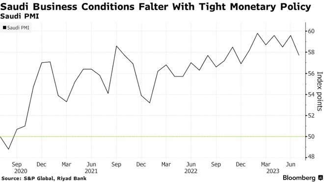 随着利率上升开始影响沙特阿拉伯的非石油产业,该国的商业增长速度在7月份有所放缓。根据利雅得银行的数据,沙特阿拉伯的采购经理人指数(PMI)为57.7,低于6月份的59.6。虽然这个数字仍然远高于临界点,但增长速度的放缓主要是由于新订单增长疲软。这一现象表明,沙特的私营部门已经开始感受到货币紧缩条件的影响。