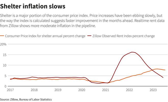 住房成本约占CPI“篮子”的三分之一。在新冠疫情早期,住房成本在推高通胀方面发挥了核心作用。如今,住房成本将有助于缓解通胀。旧金山联储的经济学家近期利用美国房地产服务公司Zillow等公司的实时住房和租金数据进行了一项研究,并预计到明年年底,“住房通胀将出现大幅好转”。他们估计,住房通胀预计将降至5%以下,甚至可能转为负值,“这对整体通胀具有重要影响”。