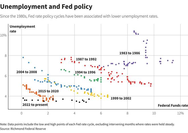 此外,里士满联储的经济学家上周表示,鉴于美联储在降低通胀方面取得的进展,而失业率没有显著上升,美联储处于历史上“未知的”境地。他们指出,回望美联储过去的利率周期,自上世纪80年代以来,失业率在每一次利率周期中都波动较小,这对那些希望在不让劳动力市场付出沉重代价的情况下将通胀拉回到目标水平的政策制定者来说是个好消息。