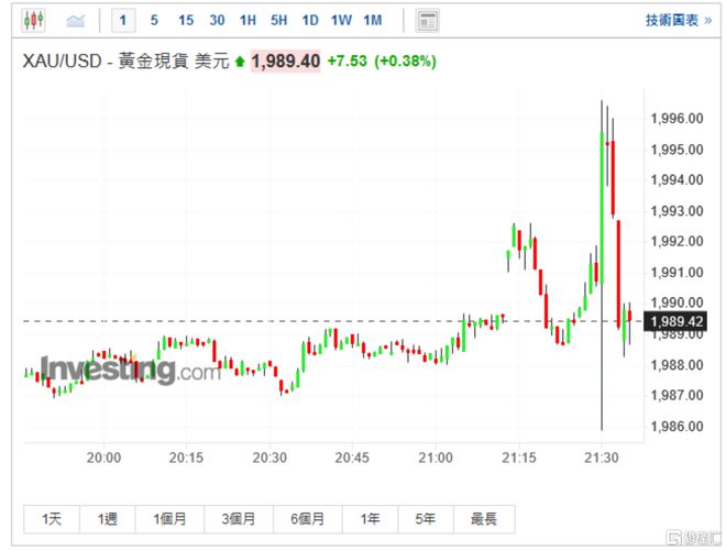 数据公布后,现货黄金一度升至2012.30美元的日内高点,现几乎回吐全部涨幅,报1989.40美元/盎司。
