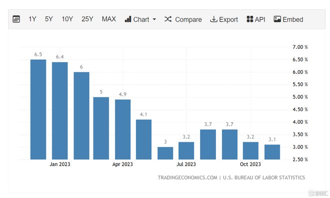 具体来看,11月住房指数继续上涨,这抵消了汽油指数下降的影响。能源价格下跌2.3%有助于抑制通胀,其中,汽油价格下跌6%,燃料油价格下跌2.7%。食品价格环比上涨了0.2%,主要是受餐饮店食品价格上涨0.4%的推动。同比方面,食品价格上涨2.9%,而能源价格下跌5.4%。占CPI权重约三分之一的住房价格当月上涨0.4%,12个月累计上涨6.5%。