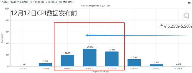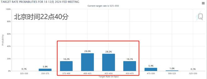 根据CME“美联储观察”工具显示,今晚数据发布前,市场预估2024年末的联邦基金利率将主要落在3.75-4.5%区间内,对应的是降息100-150个基点。
