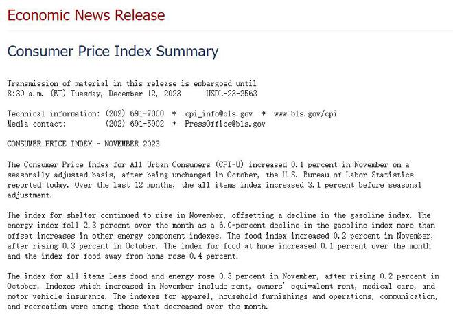 先看数据,11月美国名义CPI同比上涨3.1%,预期3.1%,与10月相比持平;去除食品、能源价格的核心CPI同比上涨4%,预期4%,与10月相比上涨0.3%。