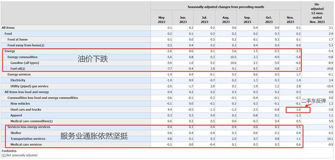 根据劳工统计局发布的数据,美国11月CPI依然呈现出“能源价格下跌、服务业价格走高”的趋势。其中汽油价格近两个月分别环比下降5%和6%,燃油价格在11月继续下降2.7%,同比降幅达到24.8%。